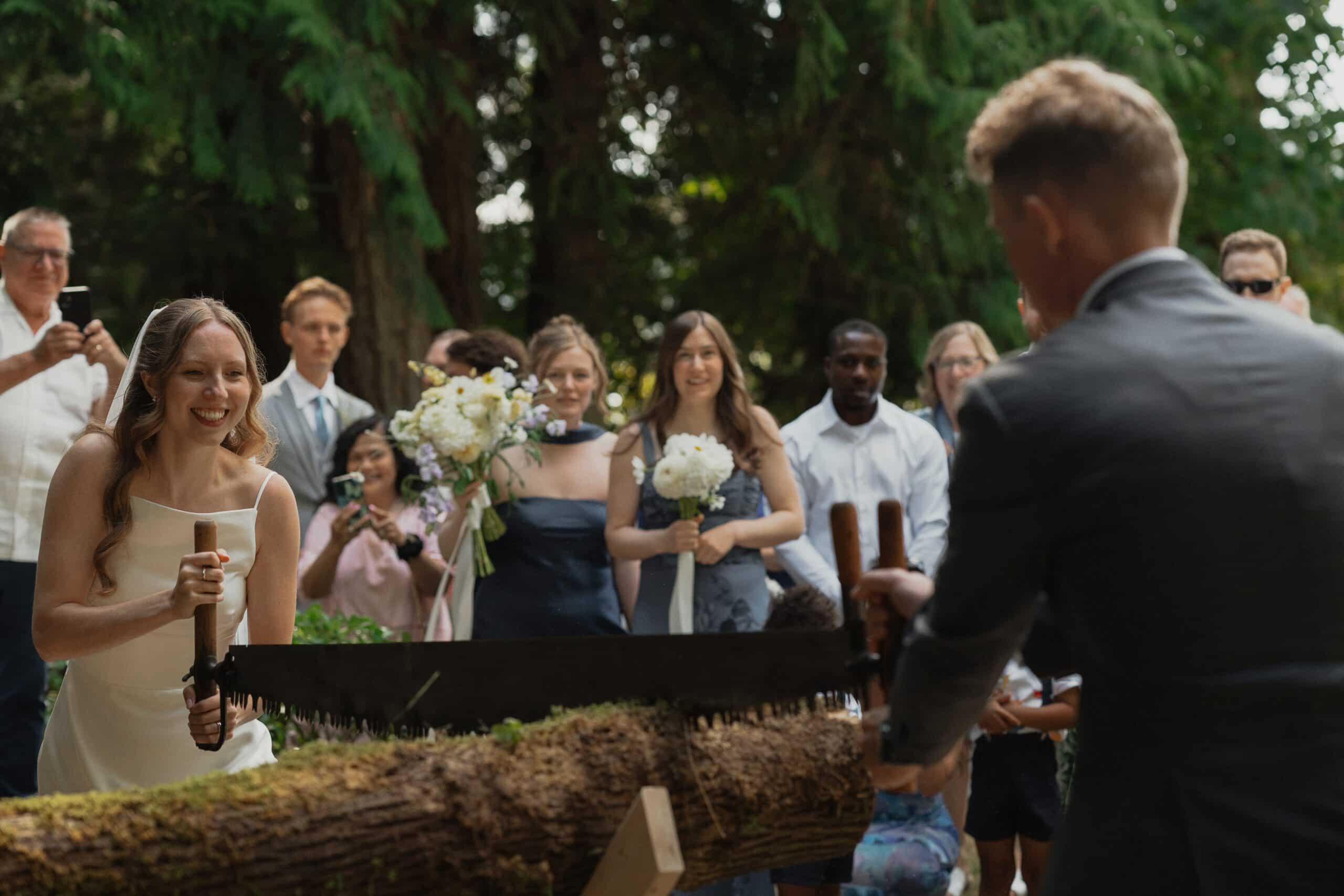 One of the most memorable moments came after the vows. Following a tradition from Josef’s background, the couple cut through a log together with a two handed saw. It was symbolic, joyful, and the kind of ritual that instantly becomes a wedding highlight. Their laughter echoed through the space as everyone cheered them on. It was so special to see their friends and family gather to help stabilize the log.